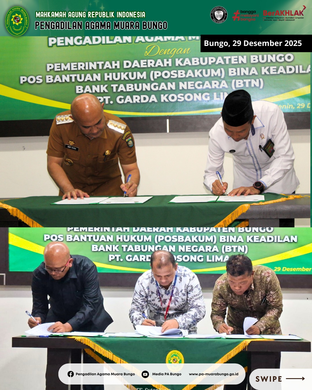 Muara Bungo, www.pa-muarabungo.go.id Senin 29/12/2025 – Dipenghujung tahun 2025 Pengadilan Agama (PA) Muara Bungo terus berupaya meningkatkan kualitas layanan kepada masyarakat dengan menandatangani empat nota kesepahaman (MOU) dengan berbagai pihak. MOU yang baru saja disepakati mencakup berbagai sektor, mulai dari hak-hak perempuan dan anak pasca perceraian, penyedia jasa bantuan hukum, penyediaan fasilitas perumahan bagi Hakim dan Pegawai Pengadilan Agama serta outsourching Tenaga Satuan Pengamanan dan Tenaga Kebersihan. MOU dengan Pemerintah Kabupaten Bungo Terkait Hak-Hak Perempuan dan Anak Pasca Perceraian sebagai langkah penting dalam melindungi hak-hak perempuan dan anak, PA Muara Bungo bersama Pemerintah Kabupaten Bungo menandatangani MOU untuk meningkatkan perlindungan terhadap perempuan dan anak pasca perceraian. Kerjasama ini bertujuan untuk memastikan bahwa putusan yang diambil dalam proses perceraian dapat mempertimbangkan hak-hak dasar kedua belah pihak, terutama perempuan dan anak-anak. "Melalui kerjasama ini, kami berharap bisa memberikan ruang bagi pemenuhan hak-hak perempuan dan anak pasca perceraian, serta mengoptimalkan peran pemerintah dalam mendukung Putusan hukum yang berkeadilan," ujar Ketua PA Muara Bungo. Sementara itu Bupati Bungo H. Dedi Putra dalam sambutannya menyampaikan akan menindaklanjuti isi Perjanjian Kerjasama ini terutama terhadap ASN yang berada dibawah Pemerintah Kabupaten Bungo pungkasnya.