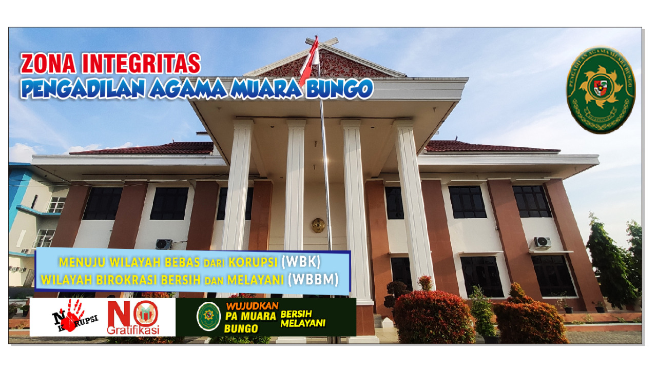 Pembangunan Zona Integritas menuju Wilayah Bebas dari Korupsi (WBK) dan Wilayah Birokrasi Bersih dan Melayani (WBBM) di Pengadilan Agama Muara Bungo merupakan upaya Pengadilan Agama Muara Bungo untuk mewujudkan Pengadilan yang Bebas KKN, Akuntabilitas Tinggi, Kinerja yang Efektif dan Efisien serta Pelayanan kepada masyarakat yang prima dan berkualitas. Untuk melihat Evidance Zona Integritas PA Muara Bungo silahkan Klik Link dibawah ini